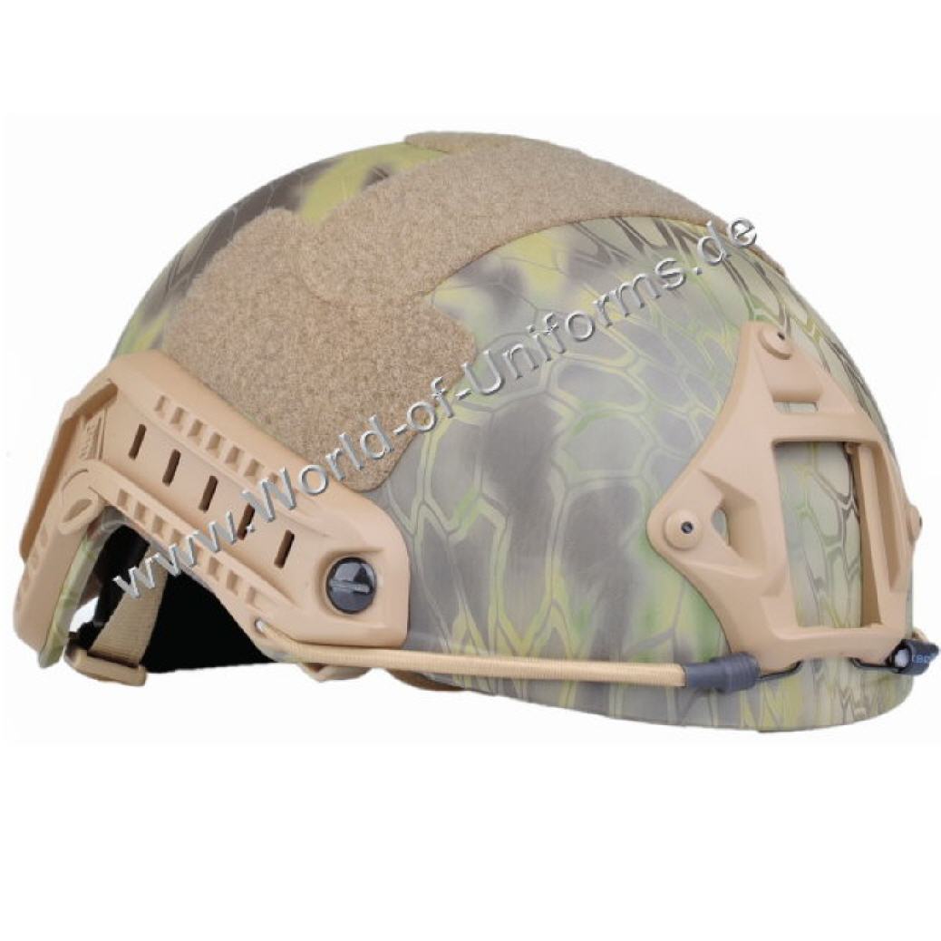 Ausgestattet mit Schienen ideal für die Befestigung von Stirnlampe, NVG, Kamera, Brille, Kommunikationseinrichtungen etc., wodurch er zum Allround-Helm wird. Der Helm ist an mehreren Stellen mit Klettband versehen.