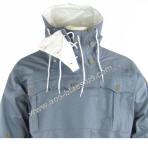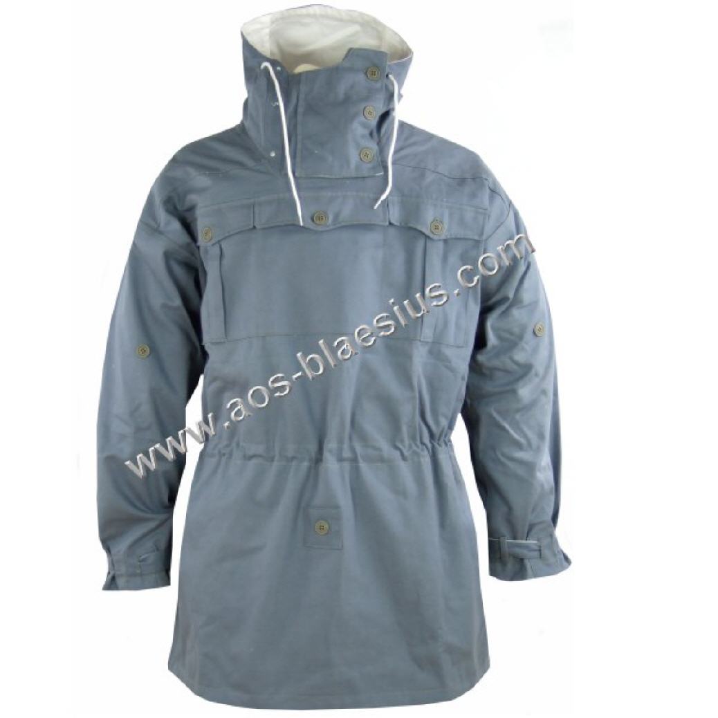 Wendetarnjacke von Grau auf Weiss, Kapuze mit extra Windleiste, je Seite 3 Brustaschen, 2 wendebare Gesästaschen, Schnallriegel an den Ärmelenden, Tailienschnürzug und Knopfleiste zum Befestigen der Jackenschöse (damit diese bei Wind nicht hochklappen).