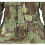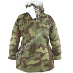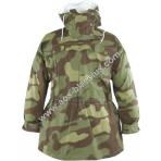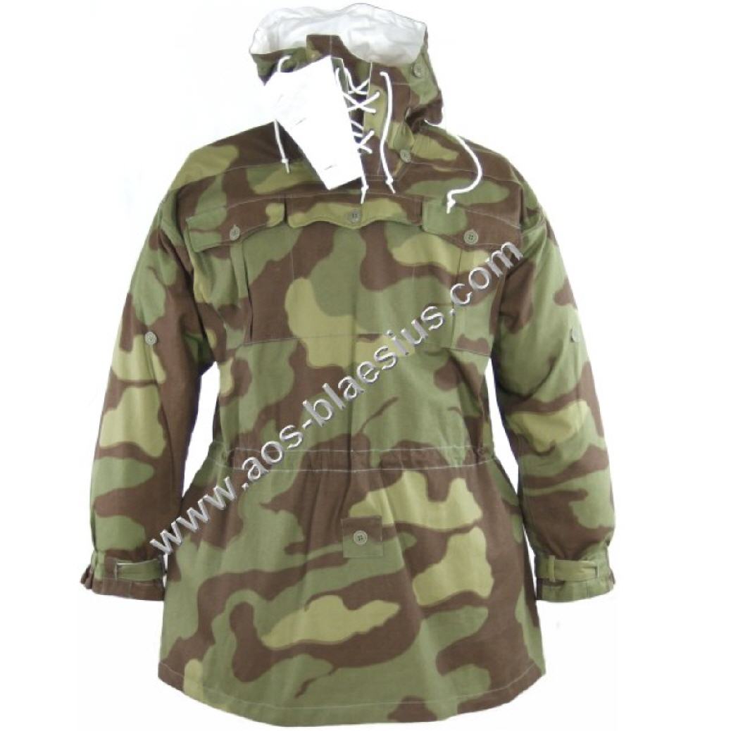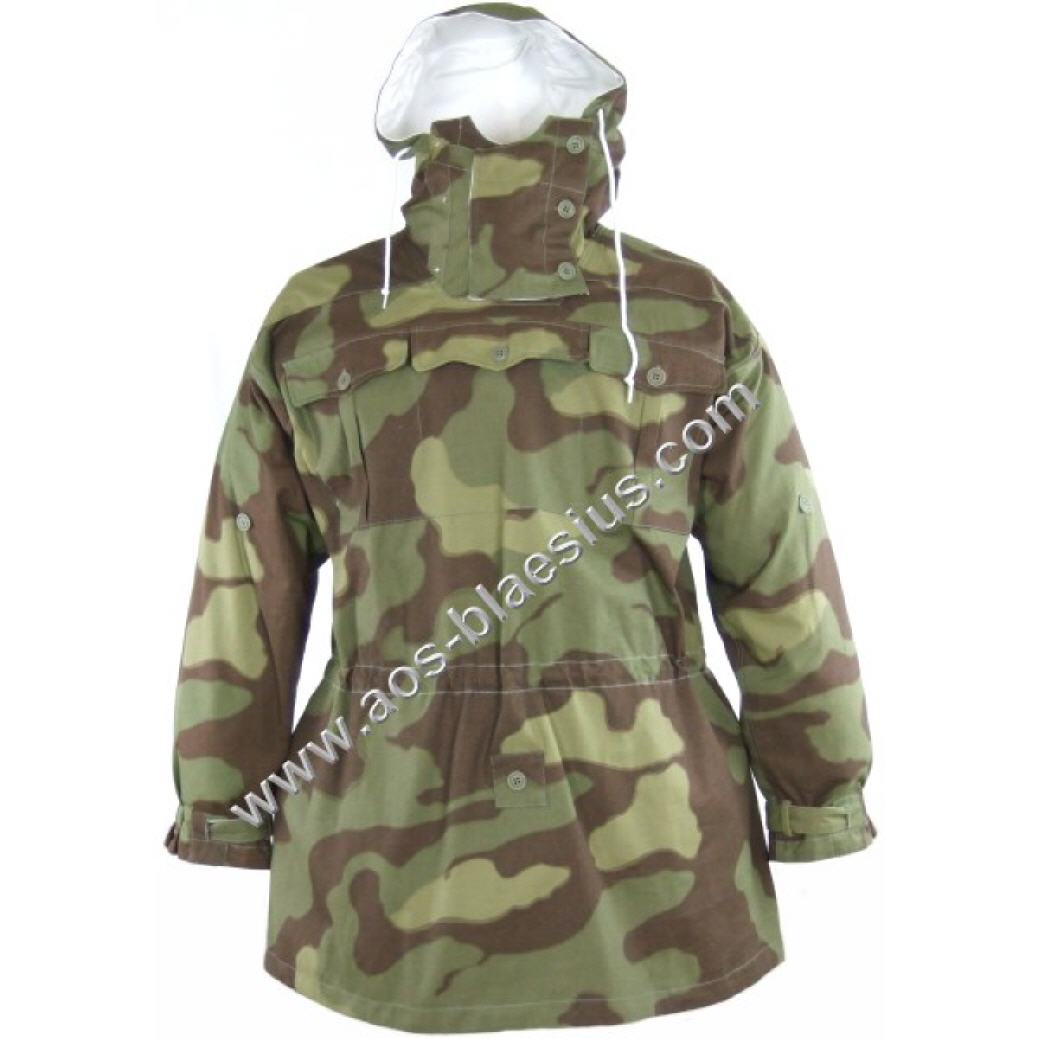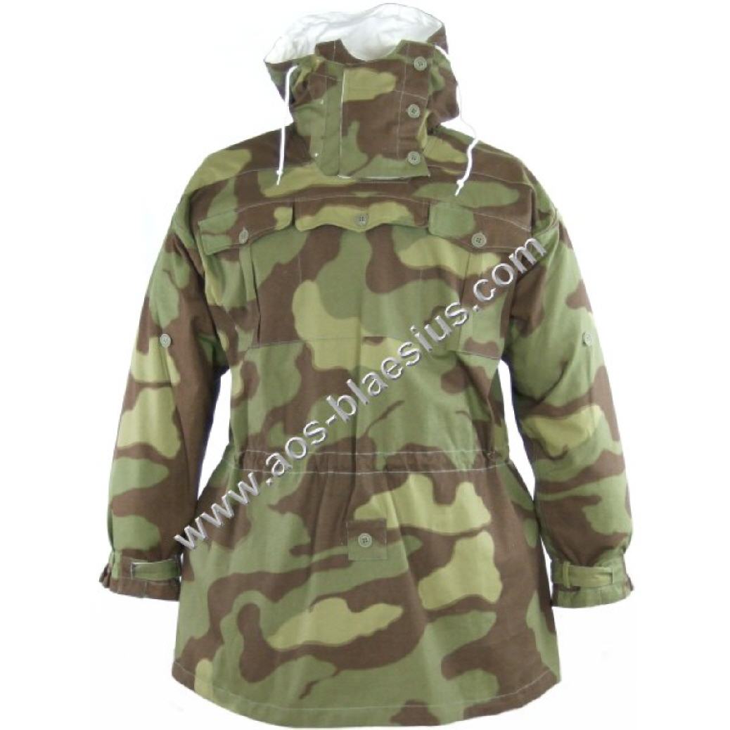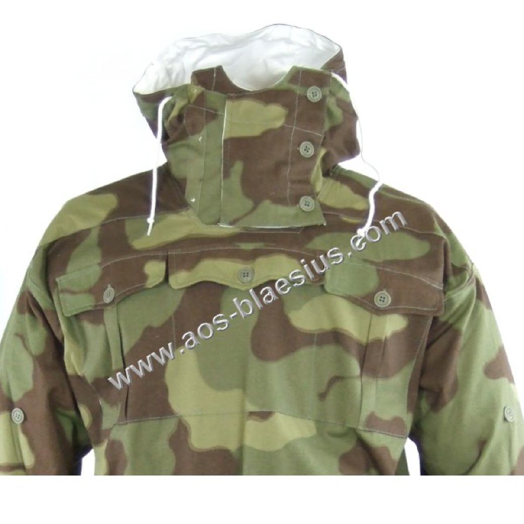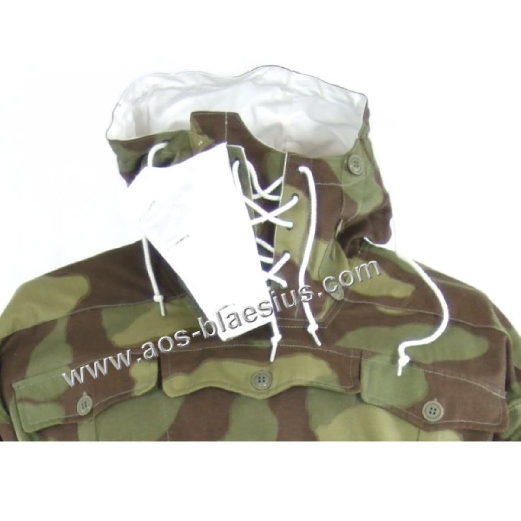 Wendetarnjacke von Italien Tarn auf Weiss, Kapuze mit extra Windleiste, je Seite 3 Brustaschen, 2 wendebare Gesästaschen, Schnallriegel an den Ärmelenden, Tailienschnürzug und Knopfleiste zum Befestigen der Jackenschöse (damit diese bei Wind nicht hochklappen).