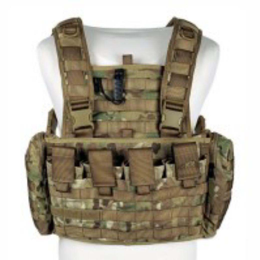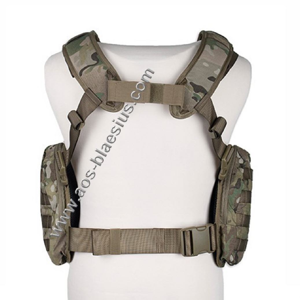 Ausstattung: Vier Magazintaschen G 36/SIG/AUG/M4-M16; Zwei Mehrzwecktaschen an der Seite (geeignet für US 1l-Wasserflasche); Sämtliche Taschen mit Reißverschuss oder Klettverschlusssystemen (verstellbar); Molle-System für Zusatzausrüstung; Ausklappbare Aufnahme für Schutzplatten (nicht im Lieferumfang enthalten); Verstellbare, gepolsterte Träger, Material: Cordura (100% Nylon)