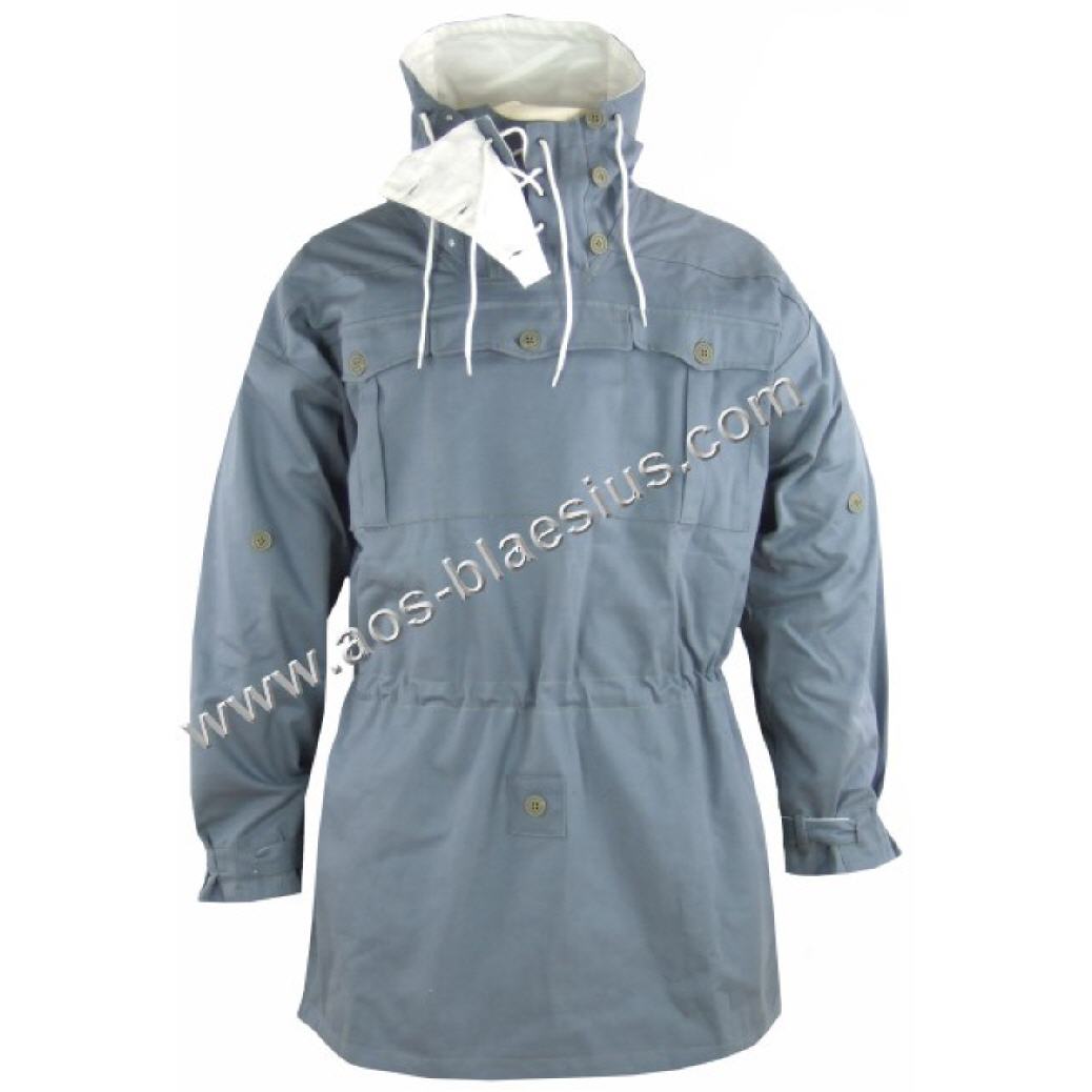 Wendetarnjacke von Grau auf Weiss, Kapuze mit extra Windleiste, je Seite 3 Brustaschen, 2 wendebare Gesästaschen, Schnallriegel an den Ärmelenden, Tailienschnürzug und Knopfleiste zum Befestigen der Jackenschöse (damit diese bei Wind nicht hochklappen).